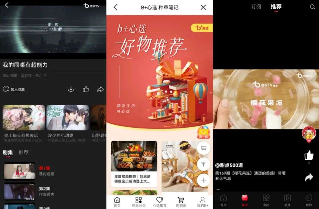 起步虽晚,也便于“查漏补缺”,它还根据当下时代潮流涉猎了微短剧领域,在app内添加了短视频和电商板块,似乎野心勃勃要成为一个全面发展无短板的选手。
