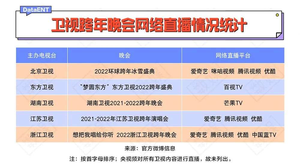 统计各家跨年网络直播情况过程中,数娱君发现一件有趣的事:除了湖南卫视跨年晚会在芒果TV进行网络直播之外,东方卫视也选择在同属SMG旗下的视频平台百视TV独播。