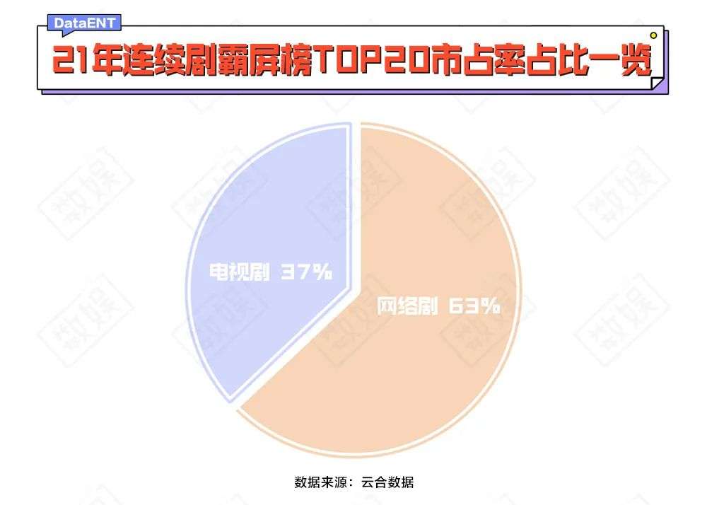根据云合数据的统计,2021连续剧有效播放霸屏榜TOP20中,网络剧占到了12席,市占率8.86%,而电视剧的市占率只有5.21%。
