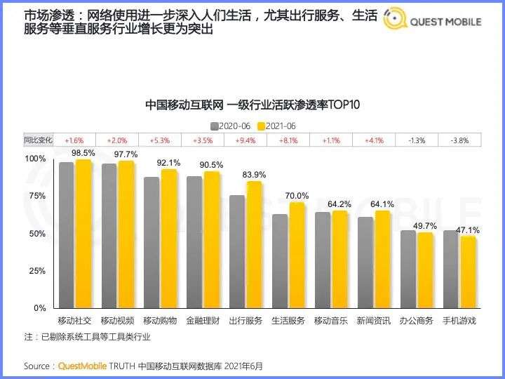 而在移动互联网的各个一级行业中,移动视频以97.7%的渗透率高居第二。