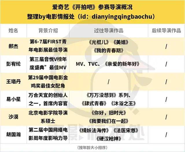 其次,令人颇感惊讶的是,参与《开拍吧》节目的导演,均未见后续导演作品公布。尤其是易小星、沙漠和胡国瀚三位,按说都具备了较为成熟的长片执导能力,但却未见其待映或筹备中作品。