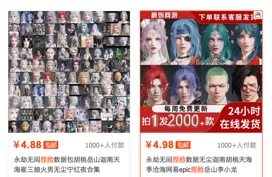我们制作好的捏脸数据一般都会卖给淘宝的商家,一般能够从卖家那里抽成40%左右,如果自己买则是100%的利润。淘宝上效率最高的几家店铺,基本都有我的作品,涉及的游戏包含《天涯明月刀》、《剑灵》、《永劫无间》等,月入在几千元。我的朋友则是自己开工作室,全职投入到游戏捏脸中,月入十万。