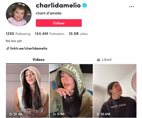 在如今的TikTok网红排行榜上,2004年出生、今年17岁的Charli D'Amelio,以全网1.34亿的粉丝数量高居榜首。