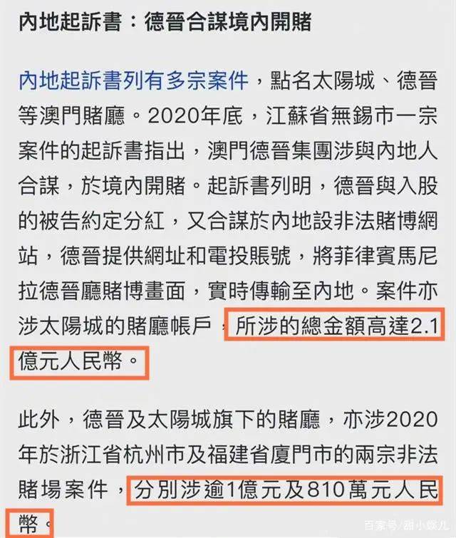报道称,内地起诉书列有多宗案件,点名太阳城、德晋等澳门赌厅。2020年底,江苏省无锡市一宗案件的起诉书指出,澳门德晋集团涉嫌与内地人员合谋,于内地开设赌场。