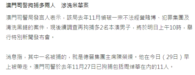 1月30日早上10点,澳门警方召开记者会表示,在调查周焯华案时,再揭发另一犯罪集团不法经营赌博及洗黑钱,拘捕2名澳门男子,已移送检察院侦办。