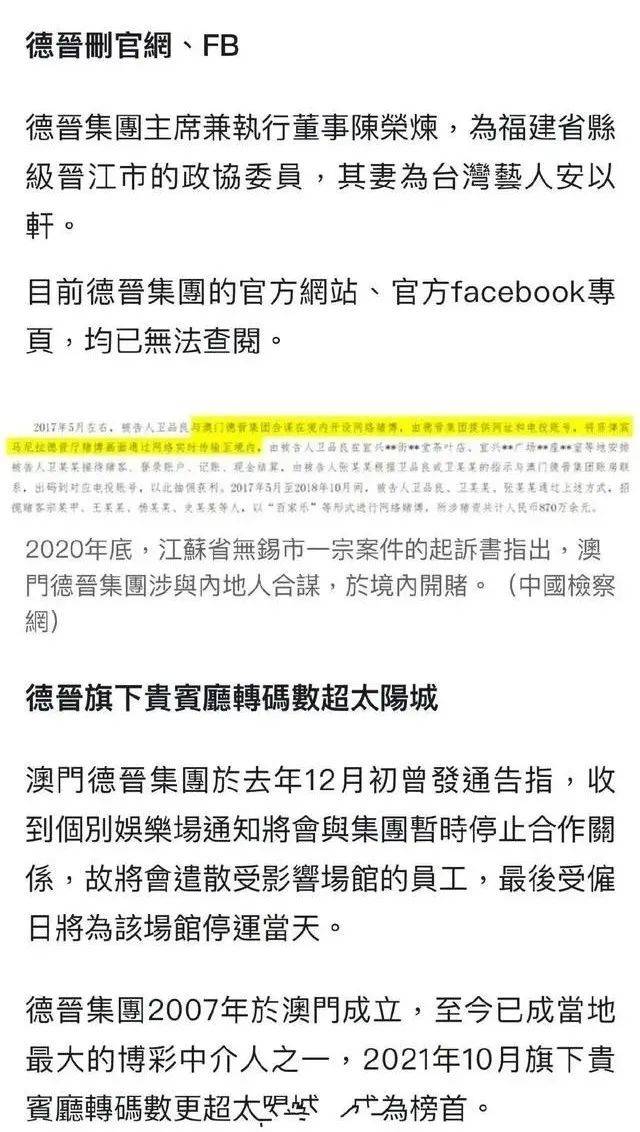 据港媒报道,目前德晋集团的官网和Facebook主页已经无法打开,但是根据之前的统计,截至2021年10月,德晋集团旗下的贵宾厅转码数已经超过洗米华的太阳城,成为澳门最大的博彩中介。