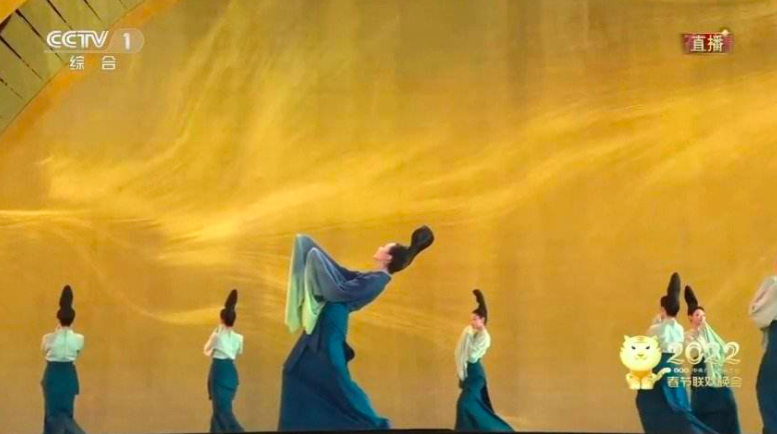 由于时间限制,虎年春晚上展示的是《只此青绿》的一段群舞。韩真表示,虎年春晚里的片段是将《千里江山图》中的青绿设色抽离出来,抽象成一位女性人物形象。这一段群舞是在表达群山层峦叠嶂的概念。
