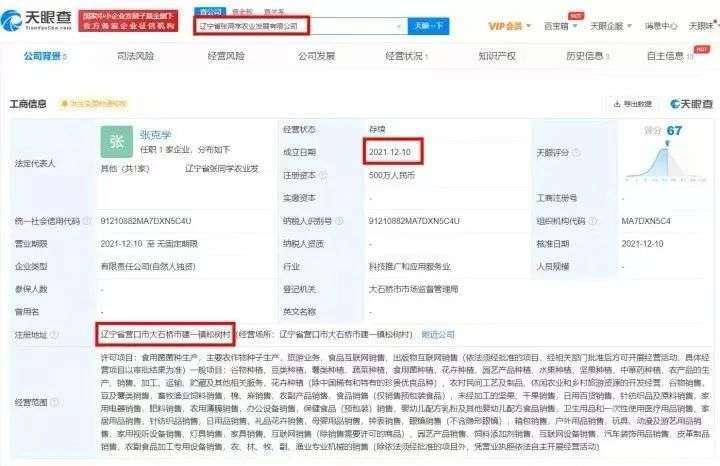 所以拒绝了MCN机构的张同学,选择了自己开公司。2021年12月10日,辽宁省张同学农业发展有限公司成立,注册资本500万元,张凯(张同学本人)担任的职务为经理。经营范围主要与农产品相关。