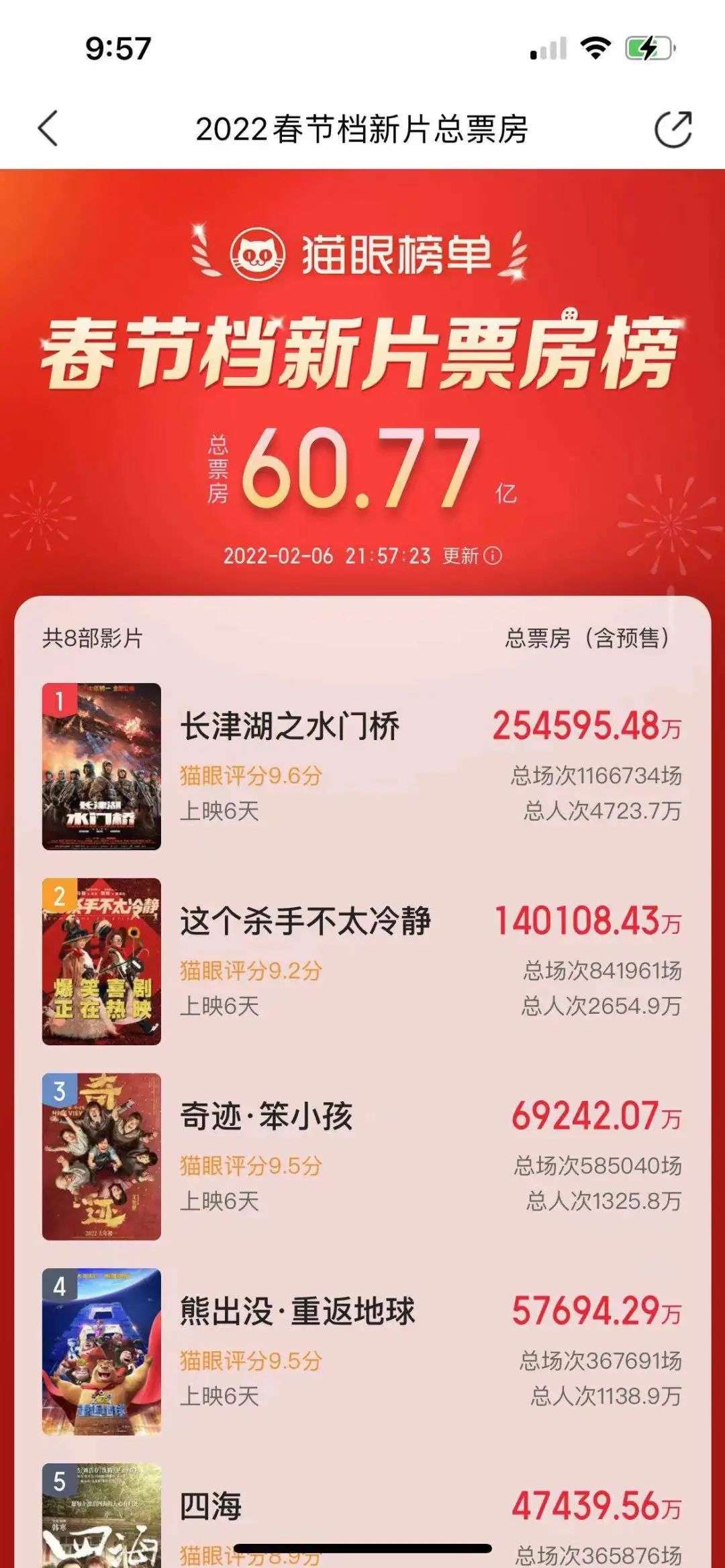 据猫眼专业版数据,截至2022年2月6日21时,2022年春节档票房超60亿,去年同期为78.43亿,与2019年同期票房(59.05亿)基本持平。
