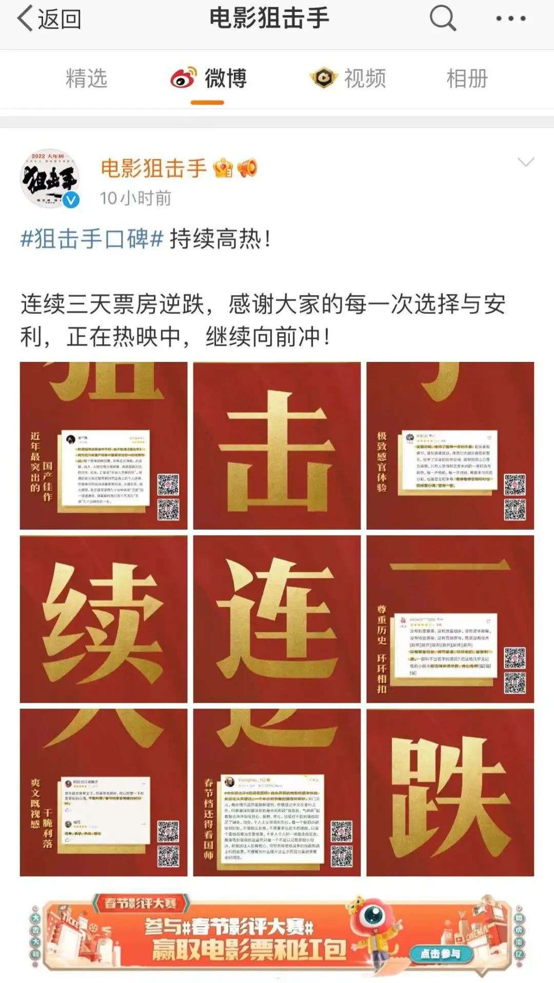 开幕式结束第三天,电影狙击手官方发布微博称,《狙击手》票房三天逆跌(在大盘普遍下降的情况下,实现增长)。