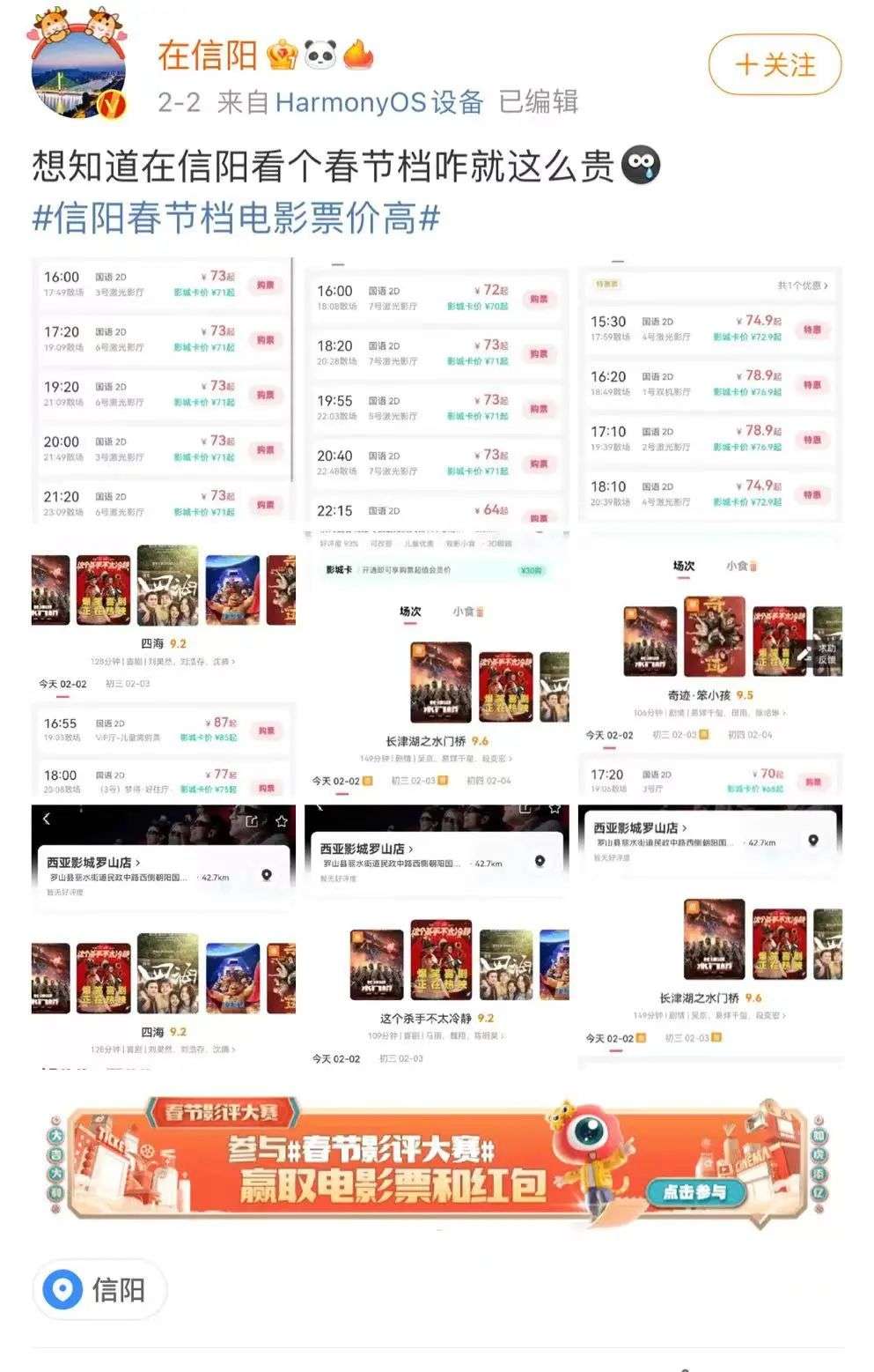 同样,大年初二,博主@在信阳在微博晒出了河南信阳多个县级城市的电影票价,几部春节档影片的价格均在70元以上。