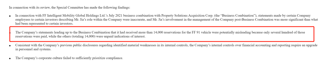 这里的“不一致之处”即此前FF号称1.4万辆订单,但实际付款仅几百人。调查文件特别指出,公司在业务合并前的声明称,已收到超过1.4万份 FF 91 车辆的预订可能具有误导性。