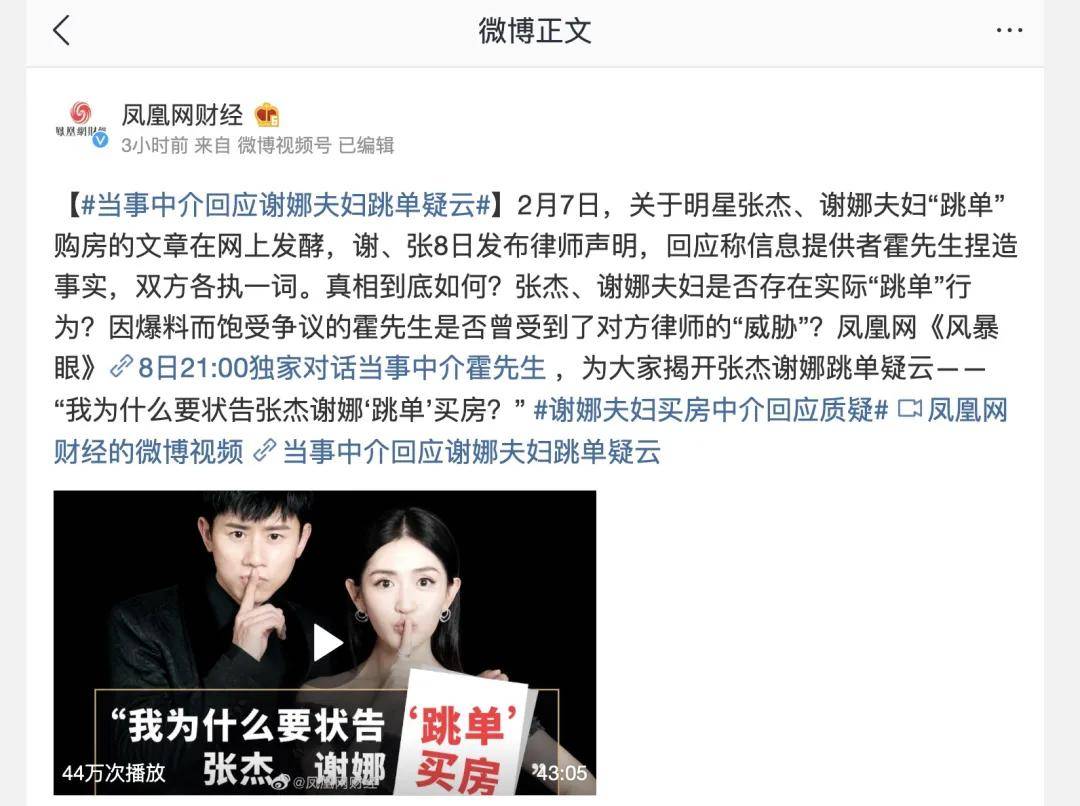 凤凰网《风暴眼》:霍先生先生你好,2月7日凌晨一篇关于《张杰谢娜夫妇跳单购房,中介感染新冠》的文章发布,到如今在微博上已经占据了几个热搜,我们也是希望霍先生能够亲自讲述一下当时带谢女士和张先生夫妇去看房的经历,以及这个事件的过程。