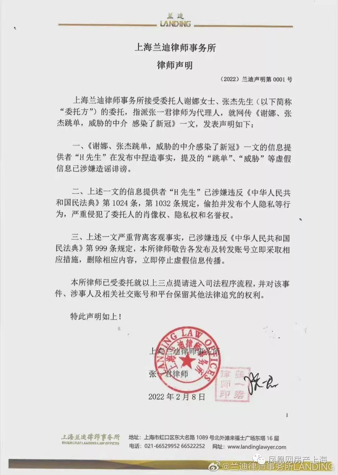 2月8日,谢娜女士、张杰委托上海兰迪律师事务所发布声明称,《谢娜、张杰跳单,威胁的中介感染了新冠》一文的信息提供者“H先生”在发布中捏造事实,提及的“跳单”、“威胁”等虚假信息已涉嫌造谣诽谤,双方各执一词。