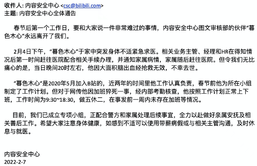 2月7日,新年后开工第一天,B站97年员工被曝加班猝死,微博博主@王落北 在微博上发文称:据多名网友爆料,B站武汉AI审核组组长因过年期间被要求加班,在晚上9点到早上9点的工作强度下,初五凌晨脑出血猝死,而公司光速把此事压了下来,现在企业微信上已查无此人。该博主微博上还称,逝者为代班组长,即拿一线的钱干组长的活。