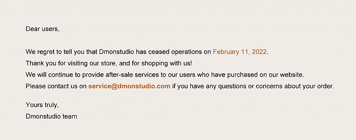根据Dmonstudio官网发布的网站运营关停公告可以看到,其具体关闭日期是2022年2月11日,不过并未就关停原因作出解释,但表示会为消费者在网站上购买的产品继续提供售后服务。