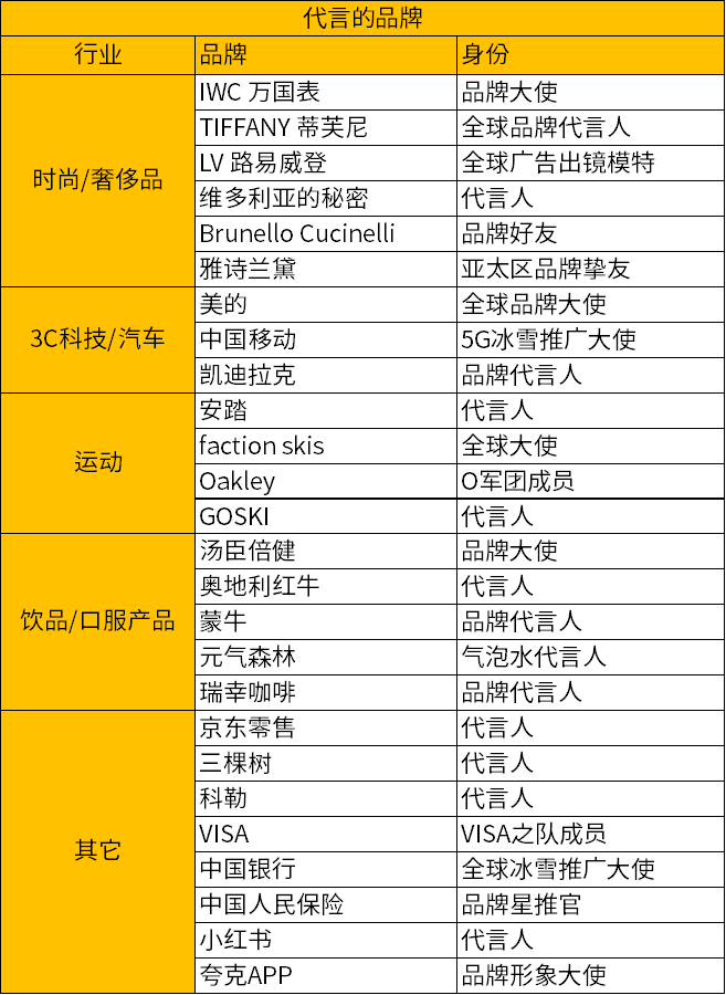 其代言品牌包含奢侈品、运动、互联网、化妆品、卫浴、饮料、手表、汽车等多个品类,已经覆盖了人们生活中的方方面面。