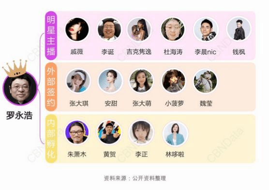 CEO黄贺表示,2021年底罗永浩GMV占比降至30%。在“交个朋友”的理想规划中,MCN业务收入预计占据总体的40%,而罗永浩的收入只占比10%-15%。据媒体统计,罗永浩本人在交个朋友直播间的时长占比已不到3%。当前其主播矩阵包括以戚薇、李诞、杜海涛为代表的明星主播,张大琪、安甜等外部签约主播,朱萧木、黄贺、李正等内部孵化主播,共签约20余人。