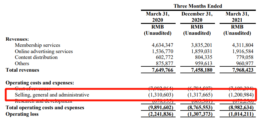 财报显示,2018年Q1的广告营销费用为7.04亿人民币,到了2019年Q1该维度营销费用就达到了11.4亿,两年Q1涨幅为4.36亿,与2017至2018年Q1的涨幅2.08亿相比,营销费用多了一倍还多。2020年Q1营销费用继续上涨,为13.1亿元,但到了2021年该维度数字为12.0亿元,实现了四年来的首次下降。