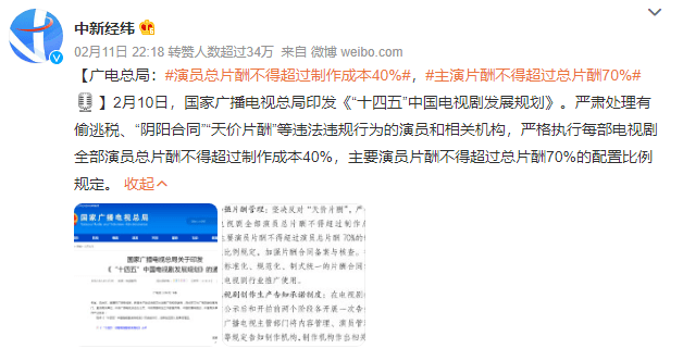 比如去年9月22日,《关于电视剧网络剧制作成本比例的意见》规定,电视剧全部演员的总片酬不得超过制作总成本的40%,主要演员不超过总片酬的70%,其他演员不低于总片酬30%。今年2月10日,国家广播电视总局又将《意见》写入了《“十四五”中国电视剧发展规划》。
