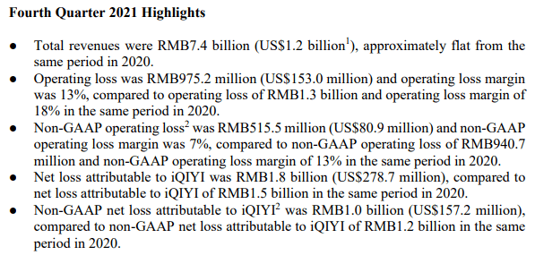 另一方面,3月1日,爱奇艺发布了2021年第四季度及全年财报,财报显示第四季度收入为74亿元人民币,与2020年同期持平,经营亏损为9.752亿人民币,营业亏损利润率为13%,而2020年同期则为18%,有所收窄。