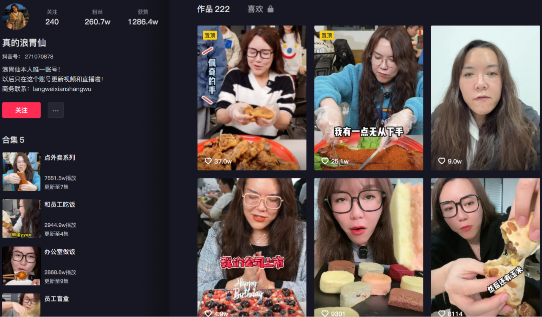 3月6日,已经停更一月以上的抖音美食大号“浪胃仙”一连发布了三条视频,只是,这次出镜的并非“浪胃仙”本人,而是自称“浪胃仙”IP创始人的游絮。