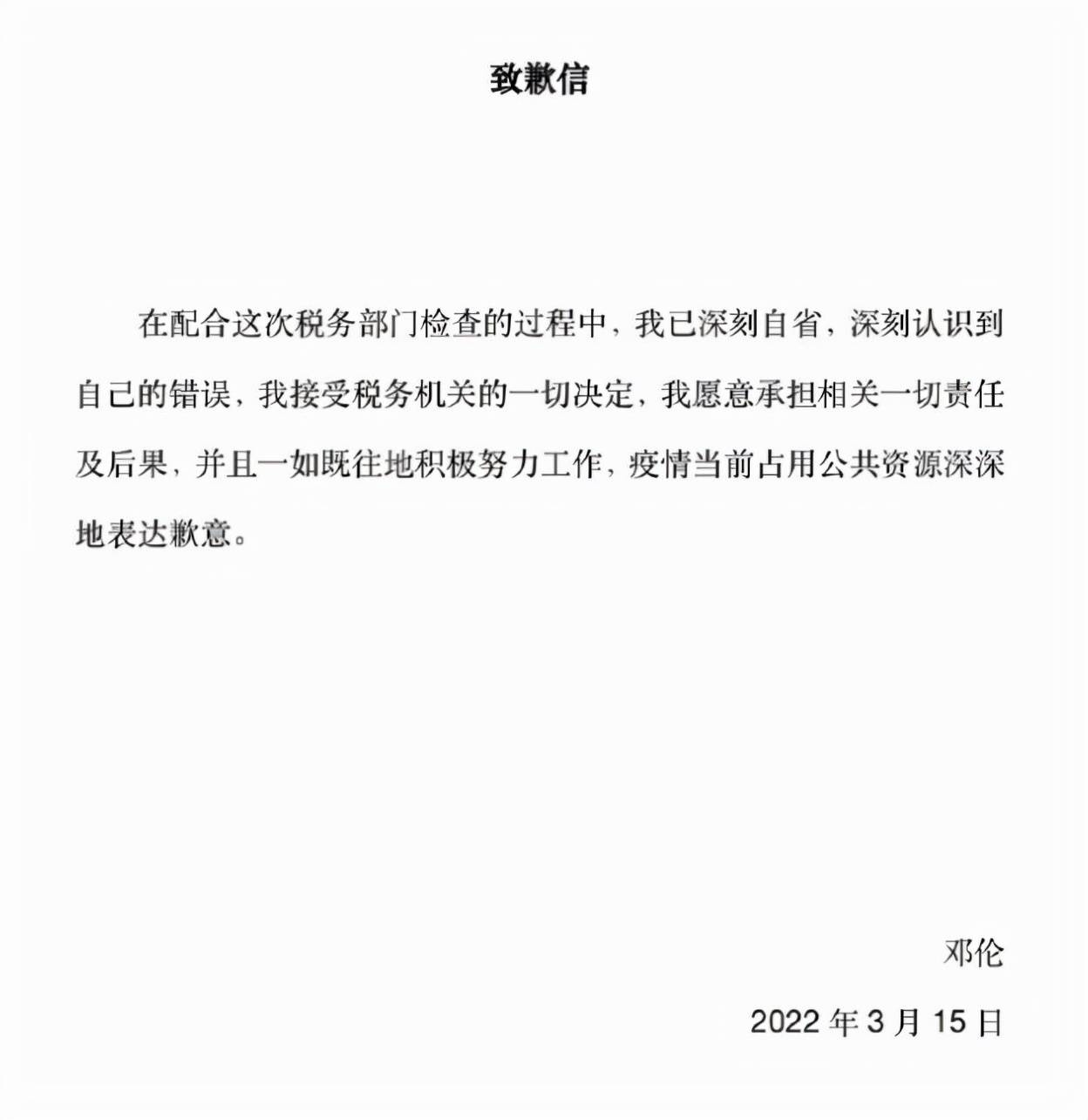 3月15日下午,邓伦在个人社交媒体发布致歉信,信中表示,自己已深刻自省、接受税务机关的一切决定,并愿意承担一切责任与后果。
