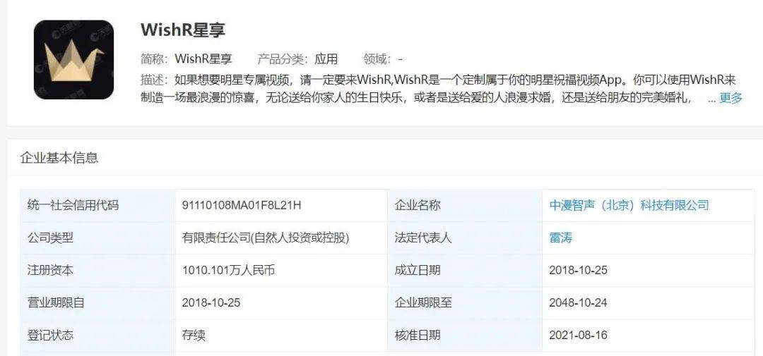 2018年10月,一款名叫“WishR星享”的App上线,创始人雷涛之前曾负责过秒拍、小咖秀、一直播等产品。其模式也基本照搬海外的Cameo,主要进行明星祝福视频的定制与售卖。