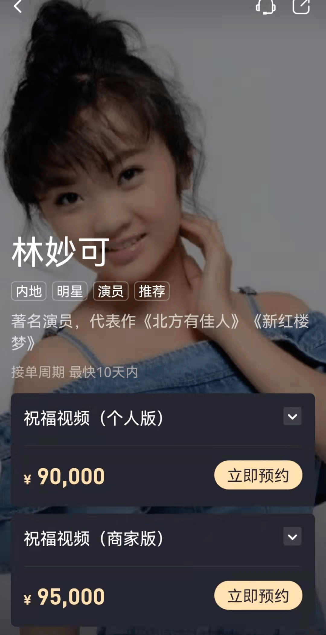 也正因为如此,国内平台中入驻的大部分都是那些渐渐被人遗忘的过气明星,同时报价也往往在五位数以上。例如还挂着小时候照片的林妙可,录一段祝福视频的单价也在90000元以上。
