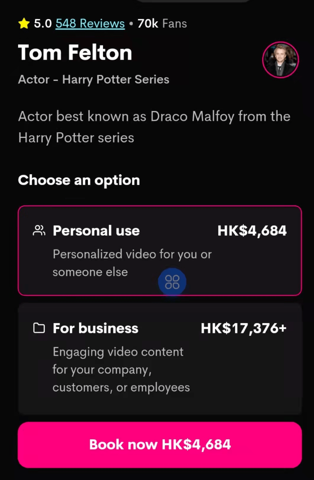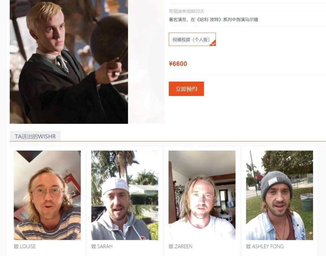 例如曾在《哈利波特》系列中饰演马尔福的演员汤姆·费尔顿,在Cameo上有7万粉丝,个人版单价为4684港元约合3786元人民币。