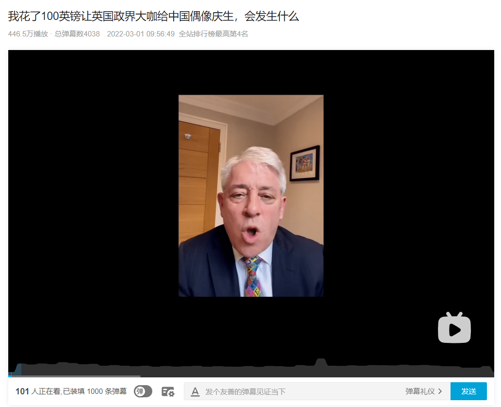 最近,一条英国前下议院院长给嘉然的生日祝福视频突然在B站爆火,截至目前已经达到了超400万的播放量。