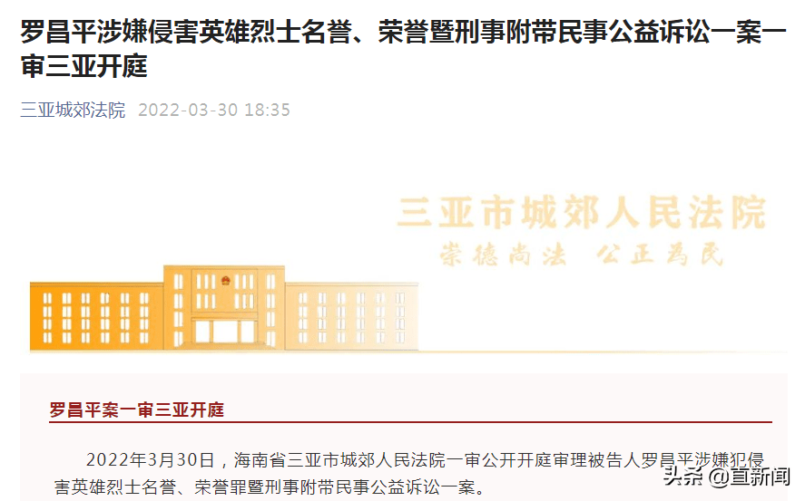 2022年3月30日,海南省三亚市城郊人民法院一审公开开庭审理被告人罗昌平涉嫌犯侵害英雄烈士名誉、荣誉罪暨刑事附带民事公益诉讼一案。