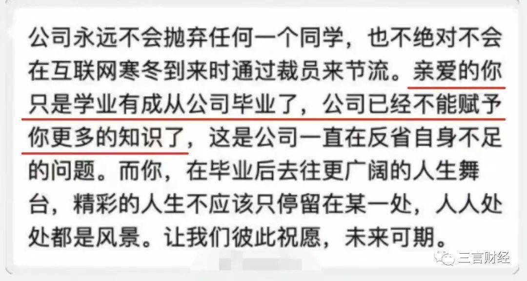 还有公司发表一段“感人肺腑”的感言:“亲爱的你只是学业有成从公司毕业了,公司已经不能赋予你更多知识了,这是公司一直在反省自身不足的问题”。