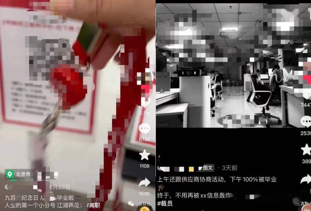 还有很多网友在短视频平台上晒出自己被裁,他们拍下办公楼、办公室,还有自己的工牌,配上伤感的音乐,并且在文案中写着自己“毕业了”。