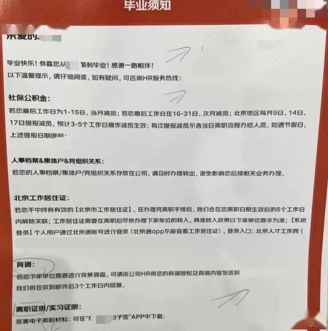 网友曝光的“毕业须知”上,公司开头加粗字体祝贺称:毕业快乐!恭喜您顺利毕业!感谢一路相伴!
