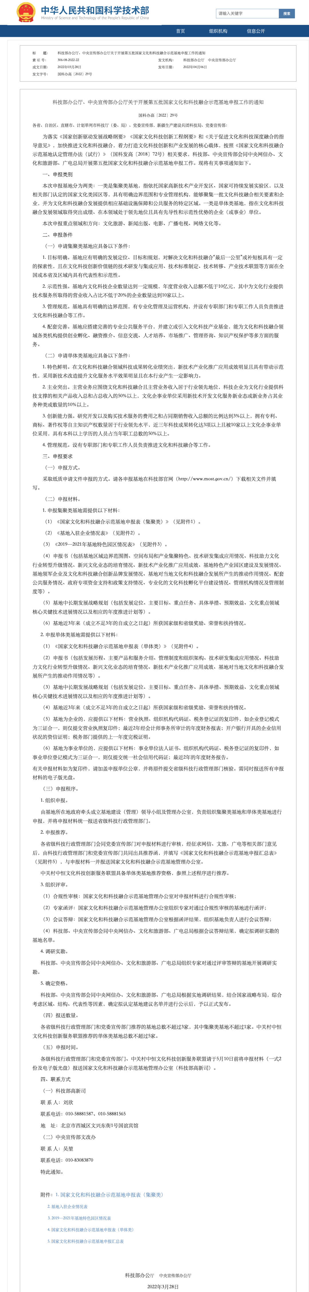 近日,科技部办公厅、中央宣传部办公厅发布《关于开展第五批国家文化和科技融合示范基地申报工作的通知》。