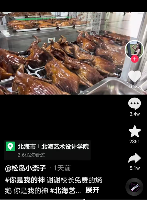 此等盛况自然少不了DJ博主的创作。DJ Morii 在自己的抖音账号发布用海清原声改编的你是我的神remix版,获得近3千万次播放,63万次点赞。同款音乐被2千多位用户使用,其中北海烧鹅版传播度最高。疫情封校期间,北海艺术设计学院校长宣布给每个寝室发放一只免费烧鹅,有学生拍下烧鹅领取现场,配上极具情绪渲染力的DJ版你是我的神,视频度颇高。