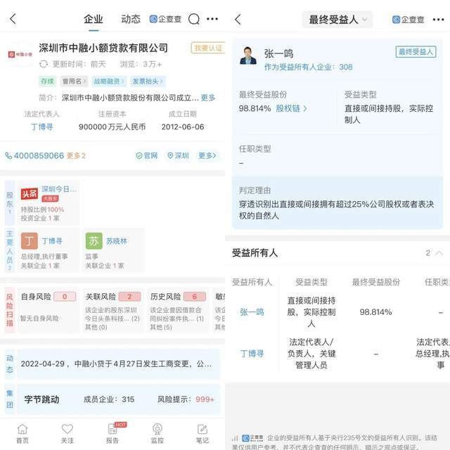 中融小贷成立于2012年,目前是深圳今日头条科技有限公司旗下全资子公司,法定代表人丁博寻,实控人为张一鸣。
