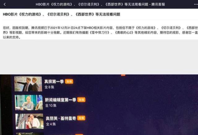 今年1月,不少HBO粉丝发帖表示,突然搜不到《权力的游戏》《西部世界》等热门美剧,连收藏列表里的HBO美剧都不能播了。HBO和腾讯视频从2014年开始的合作,在不被看好中走过七年,如今分手也分得突然,毫无预告。