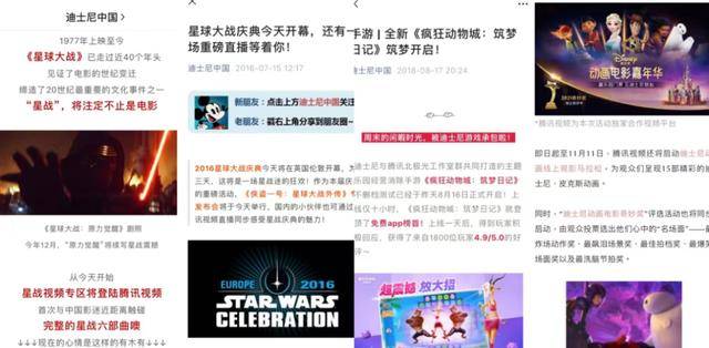 2015年,腾讯视频就在《星球大战》上映40周年之际,策划了星战专区,上线星战六部曲级电影幕后花絮等。2018年,腾讯北极光工作室打造了《疯狂动物城:筑梦日记》手游。就在几个月前腾讯视频还搞了个迪士尼动画马拉松,上线了15部迪士尼、皮克斯动画。