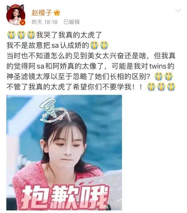 不过这件事情经过几天的发酵,目前来看舆论稍有反转。一部分原因是赵樱子在《乘风破浪》里把阿Sa认成了阿娇,她就此事在微博回应称是因为“对Twins滤镜太厚”,还冲上了微博和抖音的热搜,被网友指责是在“炒作卖人设”,有很多人反过来开始“同情窦骁”。