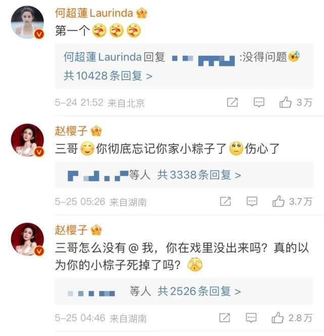 再比如,这条微博最后编辑了三次,女二赵樱子还是没出现在名单里,赵樱子直接在评论区以角色身份做回应:“三哥怎么没有艾特我,你在戏里没出来吗?真的以为你的小棕子死掉了吗?”有网友调侃道,“这不就是大学小组作业,成员最后没加我名字吗?”