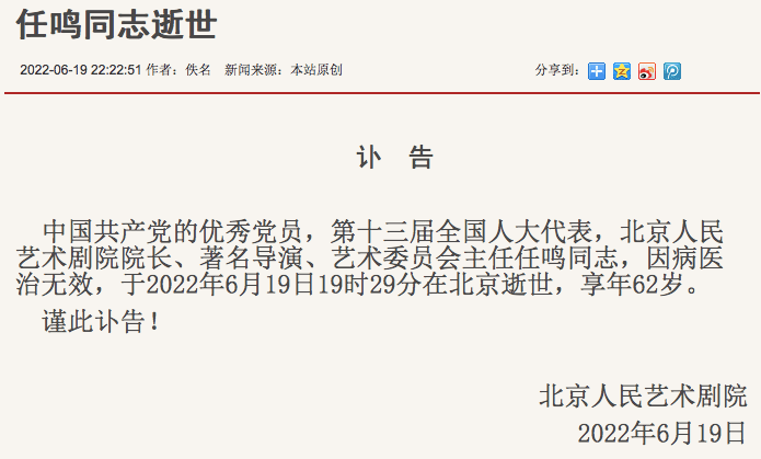 6月19日22点22分,北京人民艺术剧院发布讣告:北京人民艺术剧院院长、著名导演、艺术委员会主任任鸣,因病医治无效,于2022年6月19日19时29分在北京逝世,享年62岁。
