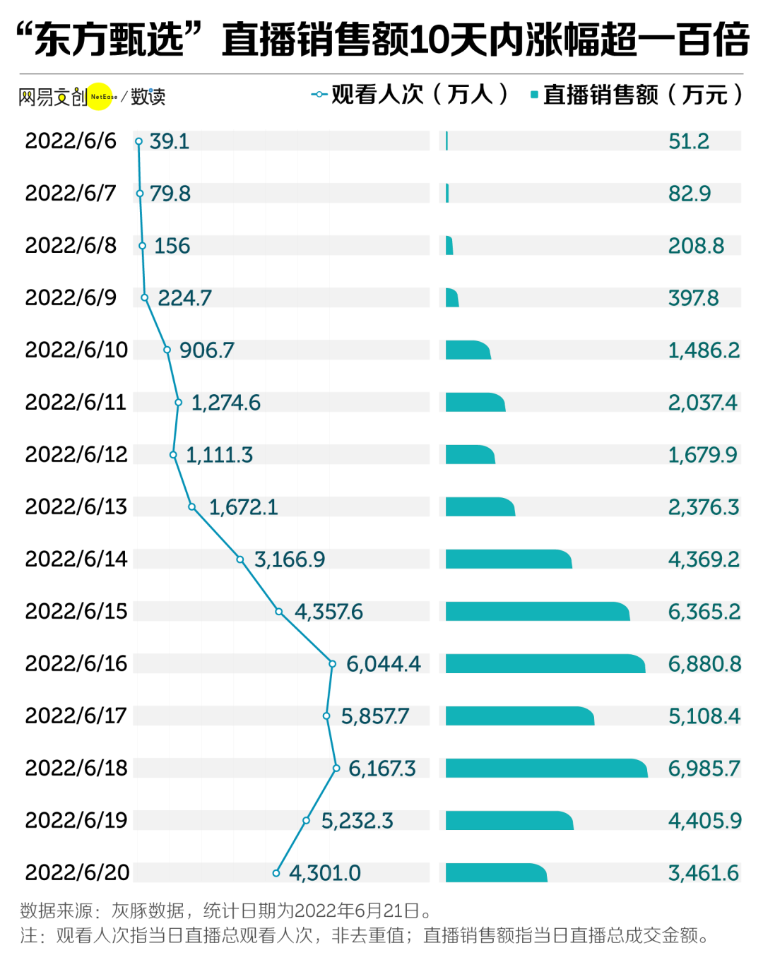 6 月 6 日,东方甄选直播间的当日总观看人次不足 40 万,直播销售额仅 51.2 万元。10 天之后,6 月16 日的直播观看人次达到超过 6000 万,直播销售额 6880.8 万元,涨幅超一百倍。