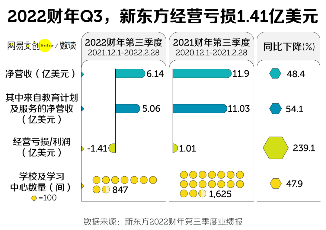 2022 财年第三季度(2021.12.1 - 2022.2.28),新东方的经营亏损为 1.41 亿美元,而去年同期经营利润为 1.01 亿美元。