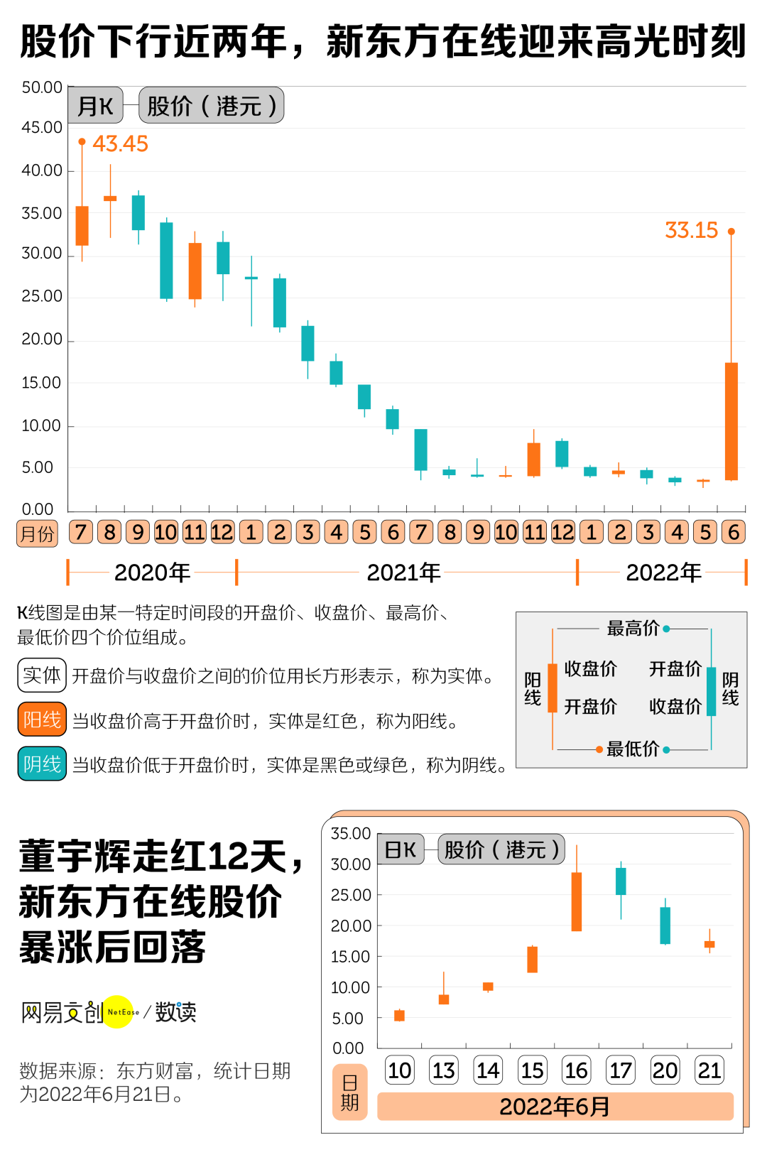 股价下行近两年后,东方甄选直播间所属的新东方在线于 6 月 16 日迎来高光时刻,暴涨 72.71%,股价一度突破 33 港元,收报 28.6 港元/股。