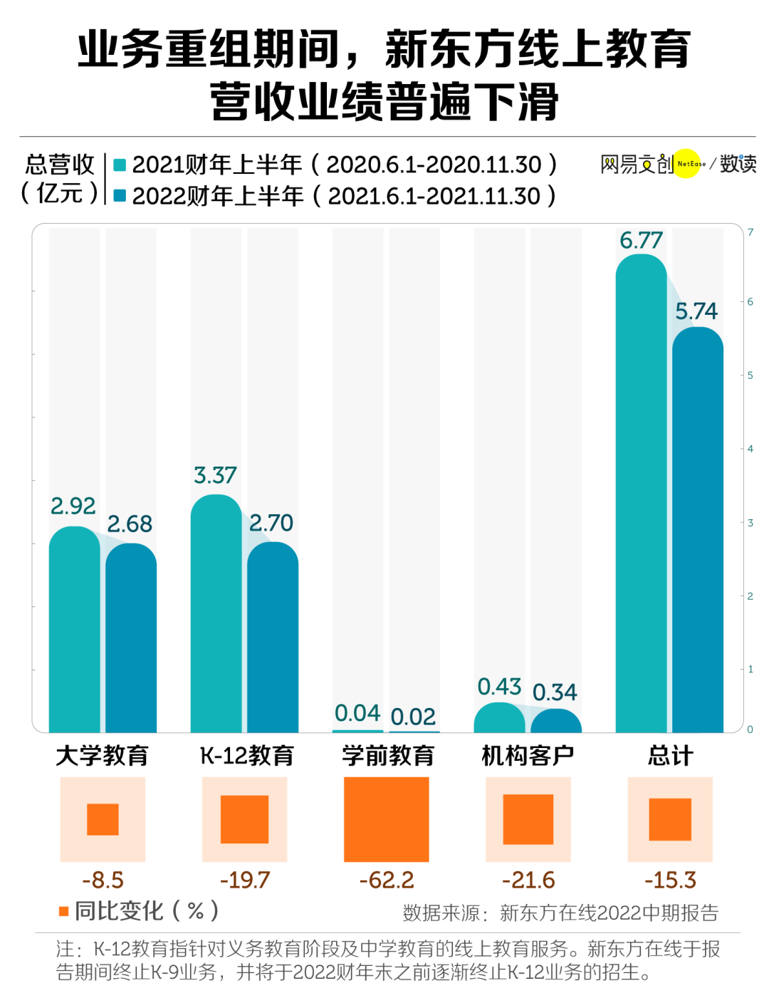从新东方在线的 2022 中期报告中,可以更清晰地看到业务重组期间,新东方线上教育遭遇的冲击。
