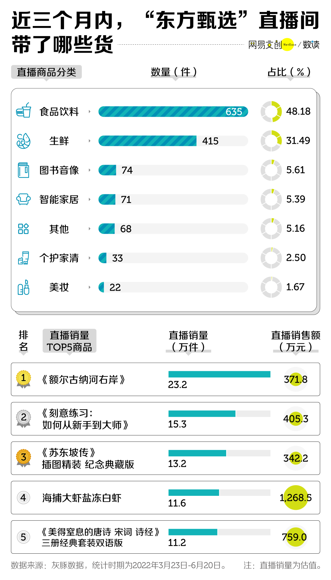 从东方甄选直播间的带货商品类目来看,包含农产品在内的食品饮料、生鲜两个品类确实是营销的主力,占比接近八成。