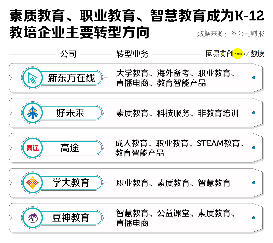 根据国内五家上市教培企业的财报,素质教育、职业教育、智慧教育是教培企业的主要转型方向,新东方和豆神教育尝试开拓了直播电商业务。