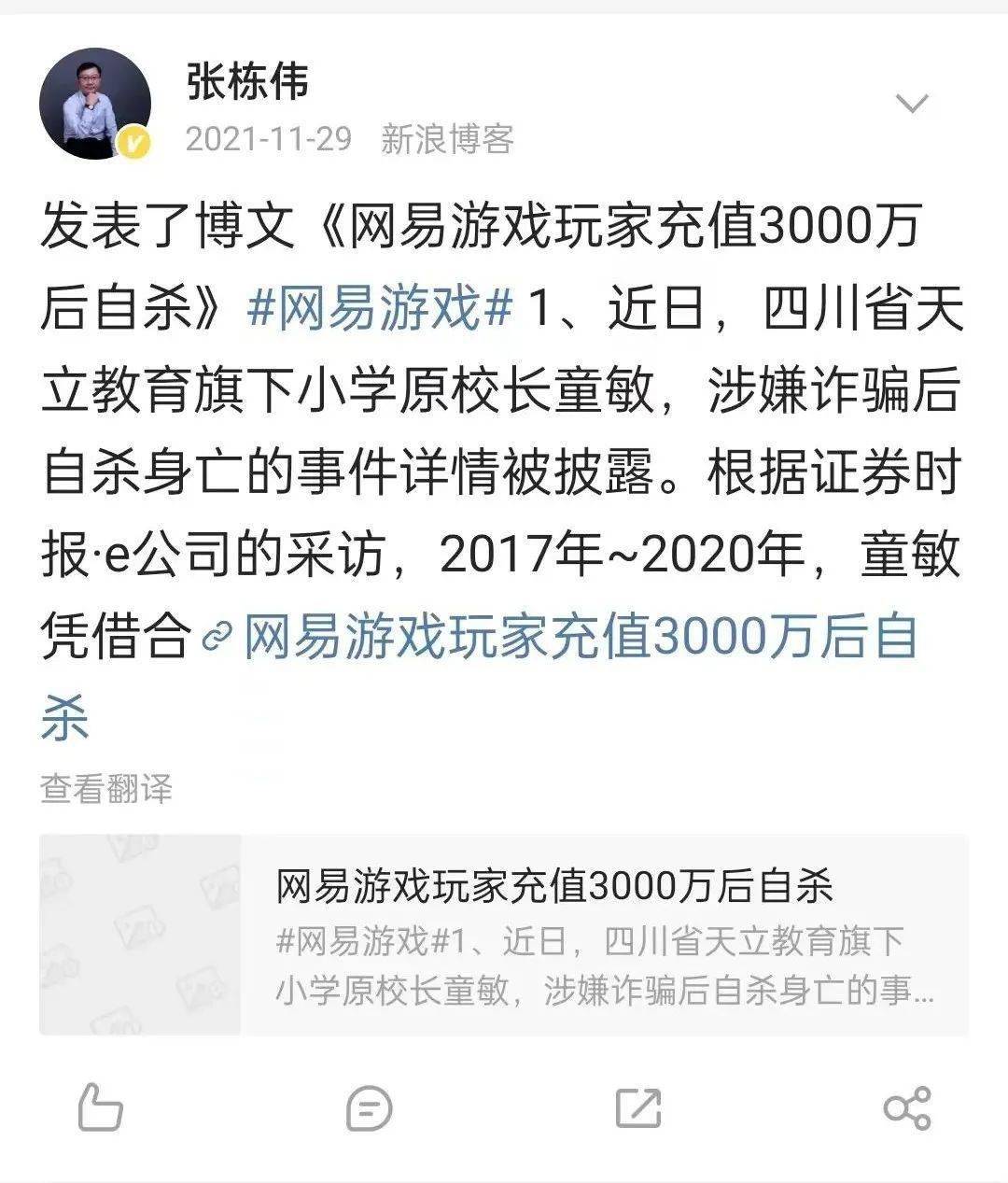在张栋伟微博搜索“网易”可发现:2020年10月,网易被约谈处罚,张栋伟发微博称不希望网易号被关停,自己在网易号有多篇“10万+”;去年11月,张栋伟发文《网易游戏玩家充值3000万后自杀》,并在结尾指责网易“充值无上限,赚钱无底线”;在收到起诉书前不久的5月31日,张栋伟也曾发微博评论“网易游戏不氪基本没法玩”。